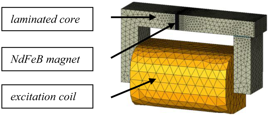 In Figure 2, we present the numerical model used to analyze the eddy current losses. Due to the symmetries of the device, only the quarter of the system is simulated with a mesh composed of 61,213 first order tetrahedral elements and 11,784 nodes. In order to account for the eddy currents for frequencies up to 2 kHz, the mesh of the permanent magnet is realized so that at least three elements are included in the skin depth.