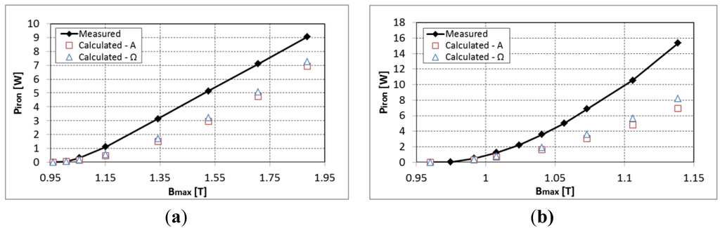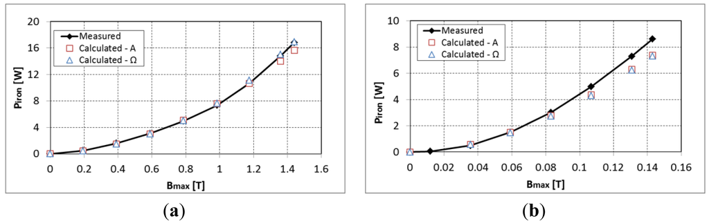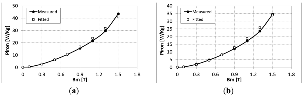From measurements on an Epstein frame, the parameters of the iron loss model were identified for different frequencies (5–600 Hz) and different peak values of flux density Bm (0–1.5 T). The identified parameters of the model are listed in Table 1 and Figure 3, the model behavior is presented for both directions the rolling and transverse directions of the lamination at 400 Hz.