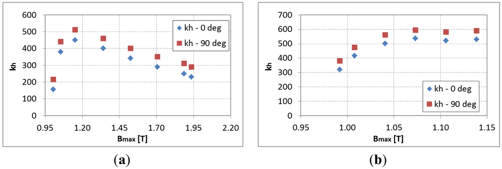 In order to compensate for this error in the computation of iron losses a polynomial variation of the kh parameter of the quasi-static hysteresis losses was identified for the considered DC magnetic flux density and depending on the Bmax when superposing a sinusoidal magnetic flux density. The evolution of the kh parameter is presented in Figure 6 for both directions of lamination at a frequency of 50 Hz and 600 Hz. It can be observed that initially the kh parameter increases rapidly but for important values of the peak magnetic flux density the iron losses start to decrease due to the saturation of hysteresis loop. Figure 7 shows the estimated iron losses after the re-identification of the kh parameter according to maximum magnetic flux density.