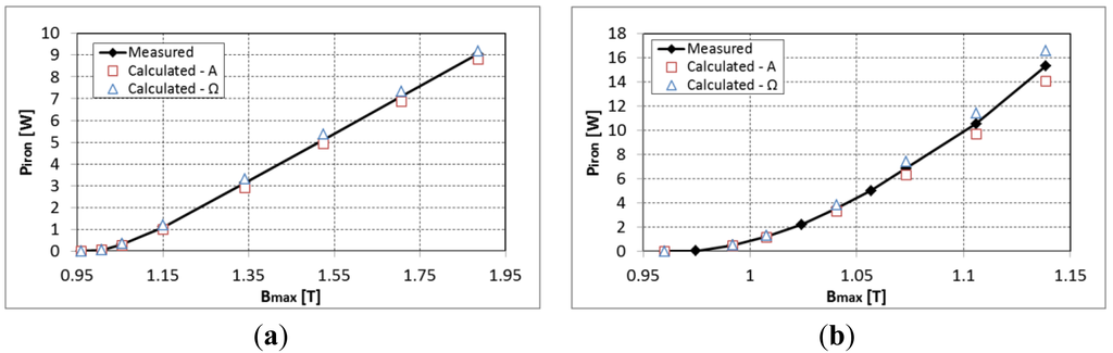 Once the copper losses PCu are extracted from the experiment, the iron losses Piron-FE obtained from the FE analysis are used in the power balance given by Equation (4) to deduce the eddy current losses PPM in the permanent magnet. Table 3 shows the results for a 400 Hz supply frequency.