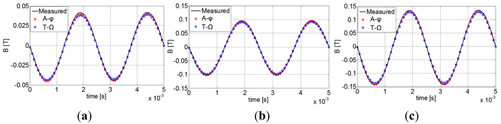 To ensure the validity of the approach, the measured global magnetic flux density of the PM is first compared with the calculated one. The obtained results for 400 Hz are presented in Figure 8 where a good approximation of the variation of the flux density in the PM is achieved.
