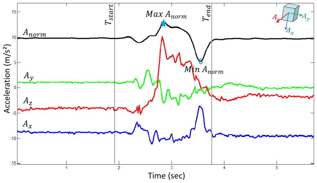 The measured acceleration on each of the three axes of the pendant-worn-sensor includes a projection of the gravity (always in vertical direction). During a chair rise transfer, the trunk exhibits first a slight forward and downward tilt to position the center of mass from the middle of the chair closer to the feet. The trunk then exhibits an upward movement to lift the body to an upright position till the end of the transfer. In this case, the acceleration measured due to motion is relatively small in magnitude compared to gravity. When computing the norm of the acceleration, the component of the measured acceleration in the horizontal direction (due to trunk tilt and sway) will have a very small contribution to that norm due to the much larger size of gravity, which contributes to the component in the vertical direction. On the other hand, by the same effect, the component of the measured acceleration in the vertical direction will have unaltered contribution to the norm. Based on this assumption, we estimate the vertical acceleration due to the motion of the chair rise transfer as the residual of the norm acceleration (Anorm) subtracting a constant gravity component of 9.8 m/s2. The maximum vertical acceleration due to the motion is defined as the residual of the maximum norm acceleration (Max Anorm) minus the gravity.