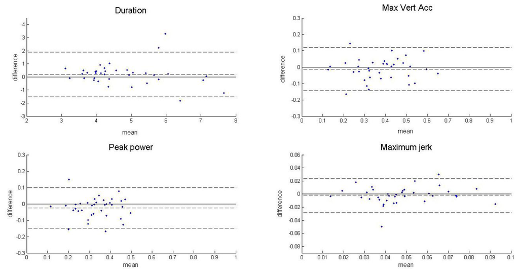 Table 3 summarizes the outcome of the analysis based on average scores of measurements over all tests. The total number of chair rise transfers (in all four tests) recorded in the test session ranged from 7 to 17 (12.83 ± 3.82) and in the retest session from 6 to 17 (12.81 ± 3.82). The average difference in the number of transfers between the test and the retest was −0.03 with a standard deviation of 1.25. The p-value of the t-test was 0.89, which indicated that no significant difference in means of the number of transfers between the test and the retest assessments. The p-values of the duration, the maximum vertical acceleration and the maximum jerk were all greater than 0.05, which indicated no significant difference in means of the test and the retest scores. The peak power had a p-value smaller than 0.05 and the lower boundary of the 95% CI was at zero, which indicated a significant difference between the test and the retest scores. All the average scores of measurements over all tests had ICC larger than 0.85. Maximum vertical acceleration had the highest ICC of 0.93 and maximum jerk had the lowest ICC of 0.86. The SEM% indicated excellent absolute reliability in the duration, the maximum vertical acceleration and the peak power but not in the maximum jerk. The maximum vertical acceleration had the lowest SEM% score, hence the highest absolute reliability. The duration, the maximum vertical acceleration and the peak power demonstrated both excellent relative and absolute reliability. The maximum jerk had only excellent relative reliability. Among all the average measurements over all tests, the maximum vertical acceleration had the highest relative and absolute reliability.