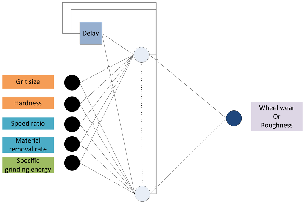 It has been therefore decided to create soft sensors for wheel wear and workpiece surface finish monitoring in grinding using ANN techniques. One of the most important decisions for the proper design of an ANN is to select an appropriate architecture. As presented in Section 1, the prediction of the wheel wear and the surface finish has been accomplished from a static point of view by employing static neural architectures when the neural network approach is adopted. In this type of networks the current outputs depend on the current inputs, i.e., the past values of the grinding variables are not considered. However, in this work the aim is to monitor the evolution of surface finish and wheel wear along time. Consequently, a recurrent neural architecture is to be selected due to the dynamic nature of the problem. In this kind of artificial neural networks past values are fed back to the inputs so as to provide the ANN with memory. Among the most extended recurrent architectures, two types can be distinguished depending on the required real samples during the ANN operation: recurrent neural networks that require initial real values (for instance, Nonlinear AutoRegressive network with eXogenous inputs NARX), and recurrent neural networks that do not require initial real values (for instance, Elman). Since measuring real values of surface finish and wheel wear is very time-consuming, these measurements are to be avoided. Thus, a recurrent neural architecture that does not require initial real values should be employed. In particular, an Elman-inspired (Equations (4) and (5)) recurrent neural network, the Layer-Recurrent neural network [20] is selected. In both types of architectures the recurrent connections are settled from the output of the hidden layer to the input layer. However, the Layer-Recurrent architecture provides more flexibility since it makes possible to have more than one hidden layer and different transfer functions in each layer: