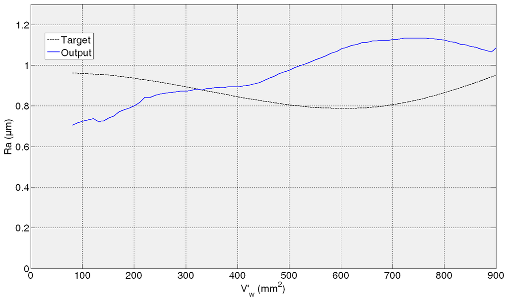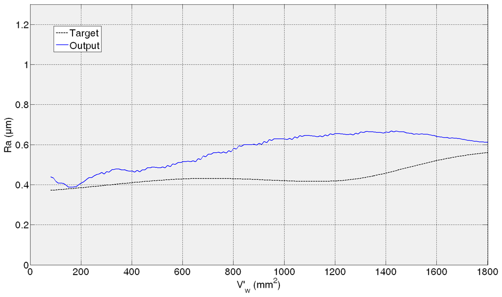 Figure 11 shows the evolution of Ra for the 82AA36K6VW grinding wheel when process variables are qs = 100 and Q′ = 2.5 (first test experiment). It can be noticed that at the beginning, sensed Ra is lower than the experimentally measured value. When more material is removed, the Ra value yielded by the virtual sensor increases and is higher than the real one. Finally, at the end both values, sensed and real, are similar. In Figure 12 the behavior is similar; Ra as measured by the virtual sensor is higher than the experimental one. In Figure 12 the evolution for 82AA70G6VW wheel and qs = 60 and Q′ = 1, second training test, is shown. Both wheels were employed during training, but under new grinding conditions. No saturation appears in both cases and AME is 0.32 μm and 0.26 μm for 82AA36K6VW qs = 100 and Q′ = 2.5; and 82AA70G6VW qs = 60 and Q′ = 1, respectively.
