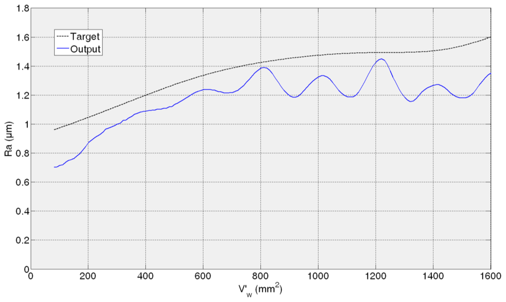Each experiment involves grinding a total amount of workpiece material of 40,000 mm3. Usually, grinding variables are referred to the unit wheel width [22]. In this case, since wheel width is 20 mm, the total specific volume of part material removed V′w in each experiment is, therefore, 2000 mm3/mm. For an industrial example, in which competition motorcycle components are ground to the final shape, this value of V′w corresponds to an approximate number of 1300 machined parts. During each experiment values of surface finish and wheel wear are periodically measured, at different values of V′w. Wheel wear is known by periodically machining an aluminium plate and comparing the difference in wheel diameter. This is a common technique at lab scale [22]. Likewise, the actual roughness of the machined part is known by using a profilometer. The measured values of both wheel wear and roughness are manually stored in software files known as experiment files so as they can be employed in the further training process.