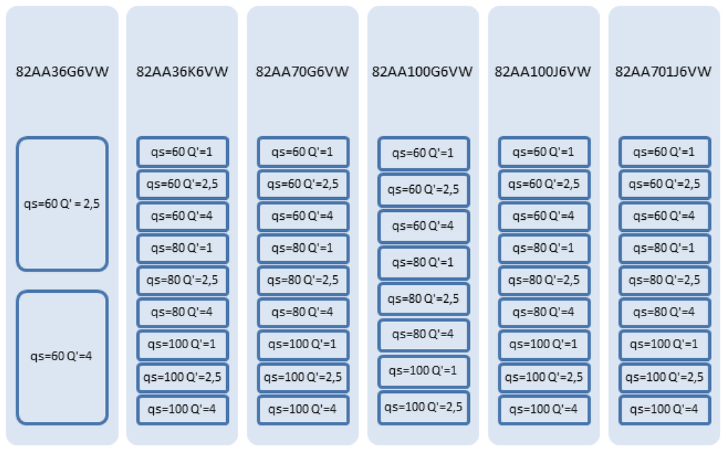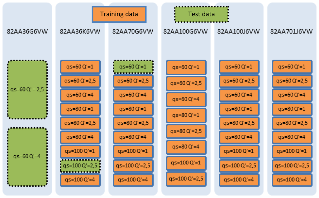 Actually, the experimental database consists of 46 experiments or sequences of 200 points each. The 200 points of each sequence correspond to subsequent values of V′w with a sample rate of 10 mm3/min yielding a time horizon per experiment equivalent to 2000 mm3/min. Thus, power consumption P, wheel wear and roughness are measured every 10 mm3/min yielding a total of 200 points each in a time horizon equivalent to 2000 mm3/min. For the 46 experiments, 42 experiments of 200 points each are used for training, and four are used for testing. Figure 5 shows this Training and Test Data Set: the training experiments are indicated by orange continuous line rectangles, and the training tests by green dashed line rectangles. It is remarkable that, as explained above, no validation examples are used since Bayesian Regularization is applied. Notice that the test experiments have been selected to assess the capability of generalization of the ANN from two points of view. Firstly, the capability of the ANN to estimate the wheel wear/roughness when using a new wheel (in other words, a wheel not used during the training process), but under known cutting conditions (in other words, the cutting conditions have been included during the training process, but with other grinding wheels). In particular, two test experiments that correspond to the 82AA36G6VW wheel with qs 60 and Q' 2.5, and qs 60 and Q' 4, respectively, are considered (see Figure 5). Secondly, the capability of the ANN to estimate the wheel wear/roughness when using wheels employed during the training process, but under new cutting conditions. In particular, these test experiments correspond to the 82AA36K6VW wheel with cutting conditions qs 100 and Q' 2.5, and to the wheel 82AA70G6VW with cutting conditions qs 60 and Q' 1 (see Figure 5).