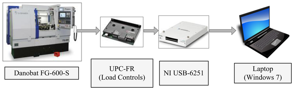 Power consumption P (see Equation (3)) at the wheel spindle is measured through a Hall-effect based transducer (UPC-FR by Load Controls). Samples are continuously stored during grinding by a NI USB-6251 board at a sample and storage rate of 100 Hz (see Figure 3).