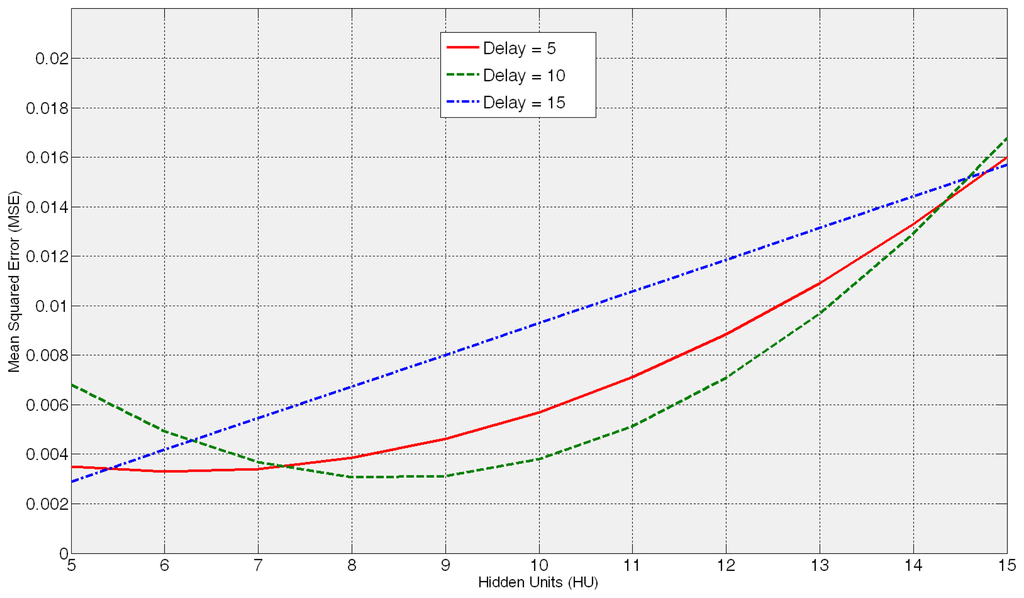 For Bayesian regularization it is said that there is no hidden units limit although it is recommended not to have more weights than half the number of training cases (the training cases are 42 in this case) [25]. Considering these indications, one hidden layer with a number of neurons HU ranging from 5 to 15 has been tested. As the number of delays D is concerned, values from 5 to 15 have been applied. Higher values of HU and D are not considered a priori due to performance purposes from the perspective of both the training time and the resource requirements (memory, processor,…) of the ANN-based sensors during its further operation.