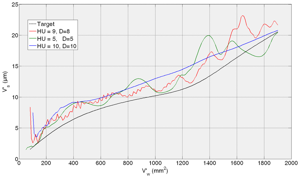 Figure 7 shows the evolution of the estimation of wheel wear for the three preselected ANNs in the first test experiment 82AA36K6VW qs = 100; Q′ = 2.5. In this case, similar good performance is achieved by the three ANNs; actually, no saturation appears in any case and AME is 13, 9 and 8 μm for 9HU8D, 10HU10D and 5HU5D, respectively, which are considered very good estimations from the grinding process perspective. On the contrary, in the rest of the test experiments the differences of performance of the preselected ANNs are more evident.