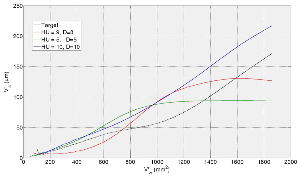 A final remark can be done from the point of view of industrial application. For many users and also for many grinding wheel manufacturers, a single numerical indicator is used to analyse the performance of wheel from the point of view of wear over time. This is known as the grinding ratio G, which is defined in Equation (10):