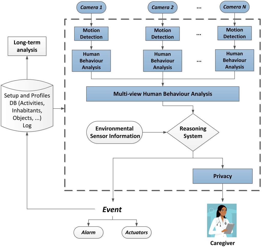 The results of the monitoring are logged 24 hours a day, making it therefore possible to perform a long-term analysis of the human behaviour based on this data. This leads to support, as well as abnormal behaviour detection. Figure 1 shows a diagram of the complete architecture of the system, where the parts that have been developed so far are highlighted. These will be further detailed in the following sections.