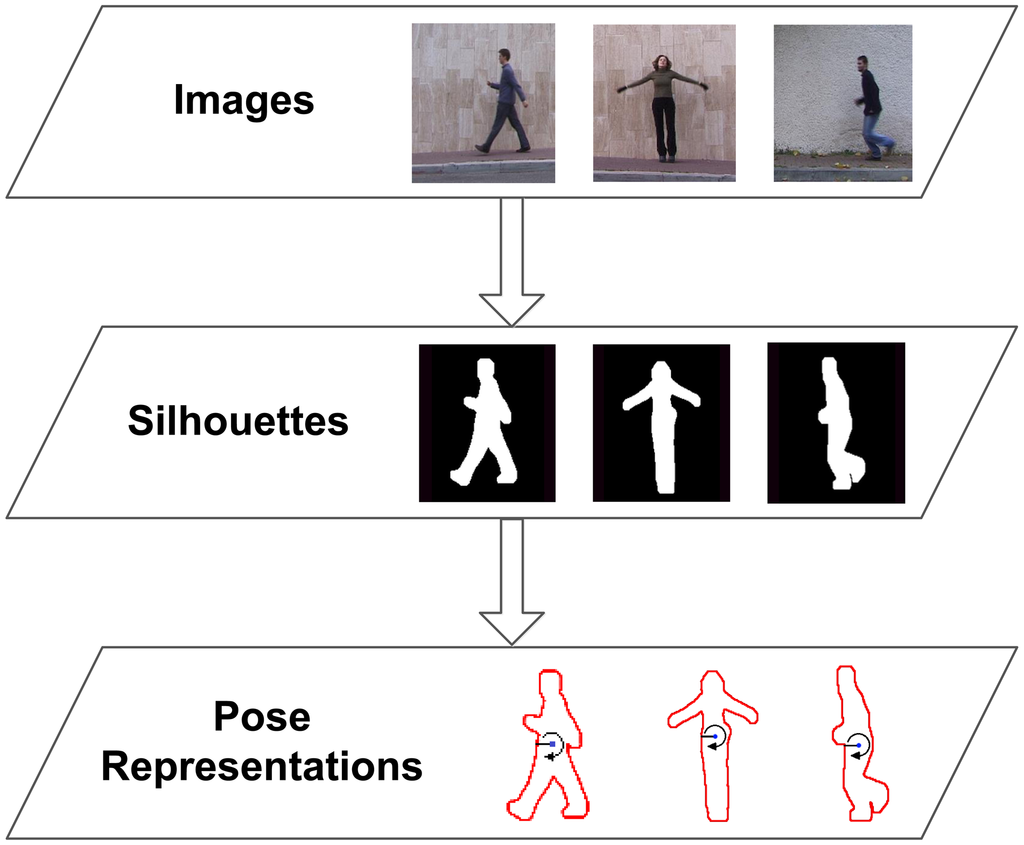 Since the method only relies on the boundary points of the human silhouette in order to obtain a contour-based feature, the actual RGB image is not always needed. As will be seen in Section 6, we use human silhouettes acquired through background subtraction or depth-based segmentation. However, the boundary of the human shape could also be obtained from infra-red, thermal and laser-based cameras, which enable other privacy preserving techniques. Figure 2 shows a diagram of the processing stages that have to be performed for feature extraction.