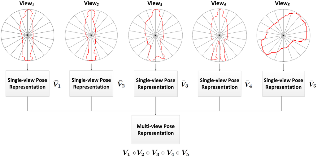 Our proposal for human behaviour analysis addresses particularly human action recognition. The method that will be laid out in this section is based on previous work, where a classification method for human actions based on a bag of key poses model [31,32] and a silhouette-based feature that relies on a radial scheme [33] have been presented. In order to improve the learning from multiple views and overcome shortcomings present in previous proposals, next, enhancements are presented for both pose representation and recognition stages.