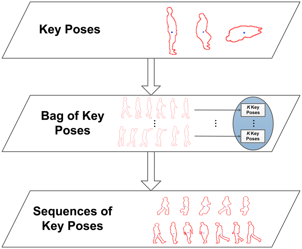 In order to retain the most representative data, key poses are obtained. Key poses allow one to recognise a human action based on a few indicative poses and make it possible to omit non-relevant or redundant pose information. In this sense, for each action class, the available multi-view training sequences are taken, and their silhouettes are processed to obtain the corresponding multi-view pose representations. These features are reduced to K representative instances using K-means clustering. The returned cluster centres are used to create the key poses, kp1…kpK, involved in each action class. These multi-view key poses are then joined together in the same bag of key poses model, which serves as a dictionary of the most relevant poses across action classes.