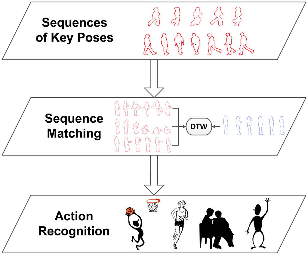 Dynamic time warping (DTW) has been chosen for the comparison of sequences. DTW finds the temporal alignment of two sequences that presents the minimal distance and is therefore able to align patterns that are shifted due to non-uniform speeds. This is essential for human action recognition, since the pace at which an action is performed depends on the age and condition of the person.