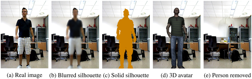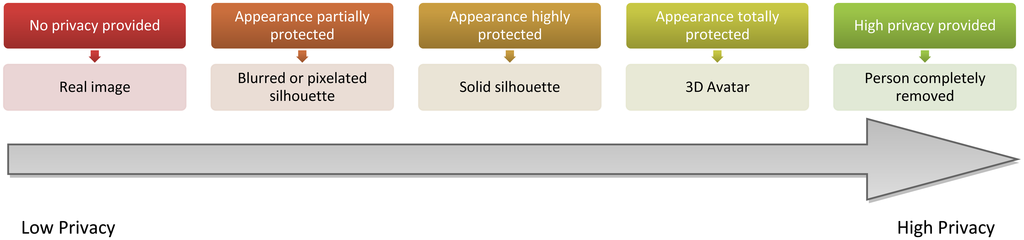 Taking into account the aforementioned constraints, five visualisation levels have been defined for the vision@home project concerning the information that should be shown or protected. This proposal is focused on the foreground that corresponds to the persons in the image, which we consider the most sensitive region. The introduced visualisation levels modify the appearance of the individual, from low protected to highly protected. As Figure 6 details, the appearance of the person is protected in each level to a different degree, either with a blurring of the region corresponding to the person, a fully shaded silhouette or the replacement of the person with a 3D avatar, which imitates the same posture and movement as the person. Finally, the person can also be completely removed. This makes it possible to preserve the right to privacy of other inhabitants that are not the subject of the current monitoring for the AAL services of telerehabilitation and videoconferences. Regarding identity, while it is not protected in low protection levels (i.e., the first two), it is in higher protection levels. Note that a silhouette may enable identification, due to height or other body features.