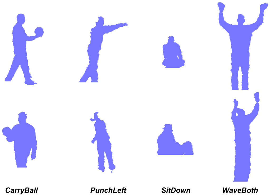 In our setup, we used two Microsoft Kinect devices recording a front and a 135° backside view. Cameras were located at 2.5 and 3.5 m, respectively, recording an indoor scenario with halogen lighting. This dataset includes the following 12 actions classes: Bend, CarryBall, CheckWatch, Jump, PunchLeft, PunchRight, SitDown, StandingStill, Standup, WaveBoth, WaveLeft and WaveRight, where the StandingStill class can be interpreted as a null class. These actions have been performed by three male actors with noteworthy differences related to their body build. A few sample silhouettes are shown in Figure 8. These have been obtained using depth-based segmentation. In future works, we intend to publish an expanded version of this dataset with more types of human motion, like gestures, actions and activities of daily living (ADL), as well as more subjects and samples.