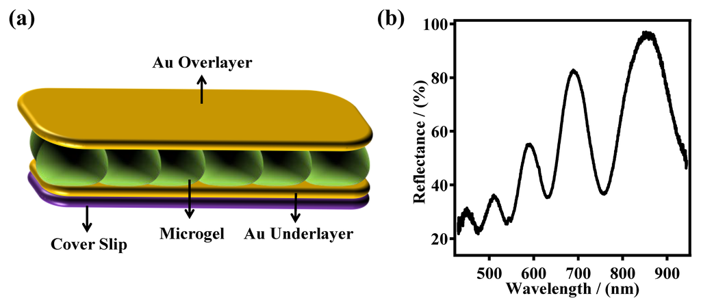 In our group, the most common functional group added to pNIPAm-based microgels is AAc, which has a pKa of ∼4.25. Therefore, the microgels exhibit negative charges at pH > 4.25 due to the deprotonation of AAc, and are neutral at pH < 4.25. Additionally, at high pH, the microgels exhibit a large diameter, relative to low pH, due to the Coulombic repulsion between the microgels negative charges. Our group has utilized pNIPAm-based microgels for a variety of applications, including sensing/biosensing, water remediation, controlled/triggered drug delivery, and as aicial muscles [11,22,27–34]. Many applications rely on the group's microgel-based etalon technology; an etalon is an optical device that we fabricate by sandwiching a monolithic monolayer of pNIPAm-based microgel particles between two thin Au layers. These devices exhibit visual color and characteristic multipeak reflectance spectra, as can be seen in Figure 1 [11,21,24,28,35–38]. The device structure is fabricated by “painting” a concentrated solution of pNIPAm-based microgels on a Cr/Au coated glass substrate [37]. The excess microgels not directly bound to the Au layer are washed away, and the layer dried followed by the deposition of another layer of Cr/Au on top of the microgel layer. The device structure is shown in Figure 1a. As mentioned above, this device exhibits multipeak reflectance spectra (Figure 1b); the position of the peaks in the reflectance spectra can be predicted from Equation (1):