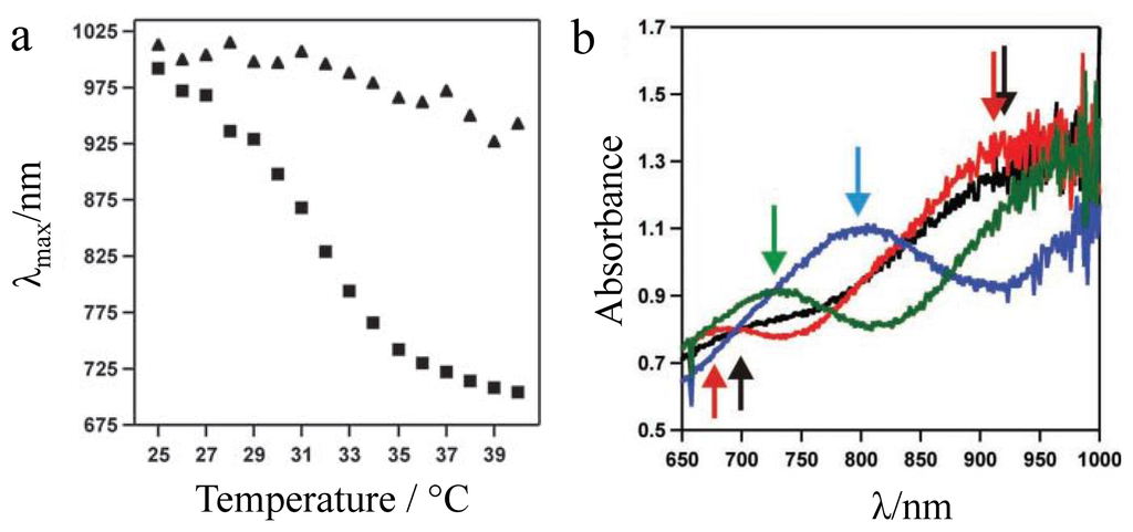Our early studies with pNIPAm microgel-based etalons were focused on characterizing their response to temperature. To characterize this, pNIPAm microgel-based devices were fabricated and their thermoresponsivity characterized in water. As shown in Figure 2, these devices are extremely sensitive to solution temperature. Specifically, the reflectance peak(s) shift ∼300 nm (blue shift) in response to a 15 °C change in the solution temperature [20]. We attributed the blue shift to the collapse of the microgels at high temperature, thus decreasing the distance between the etalons Au layers, as can be predicted from Equation (1). This was confirmed by measuring the thickness of the etalons at low and high temperature using atomic force microscopy (AFM) [20].