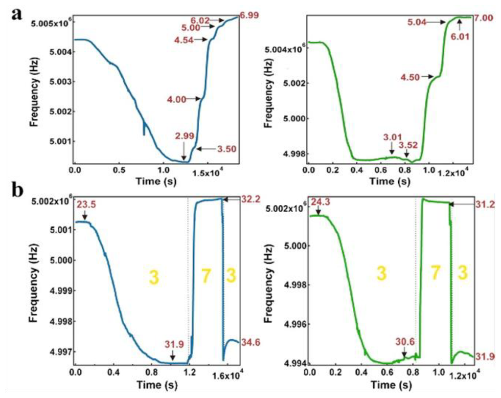 Our group has also extensively studied pH responsive microgels, and microgel-based etalons. For example, pNIPAm-co-acrylic acid (pNIPAm-co-AAc) microgels have been synthesized and etalons subsequently constructed. While we have shown that the optical properties of the etalons depend on pH, we have also shown that etalons deposited on the surface of a quartz crystal microbalance (QCM) can be used for very sensitive solution pH detection [19,39]. Specifically, it is well known that the resonant frequency of a QCM crystal is dependent on the viscosity of the solution it is contacting [28]. It is also known that collapsed microgels have a higher viscosity that swollen microgels [40]; this is also true for microgels in etalons. As stated above, AAc-modified microgels at high pH are swollen (low viscosity) at pH > 4.25, while they are relatively collapsed (high viscosity) at pH < 4.25. By monitoring the QCM resonant frequency, we were able to measure solution pH with very high sensitivity. Specifically, we first showed that the QCM resonant frequency consistently decreased as the solution (pH 3.0) temperature was increased, as shown in Figure 3. This is due to the systematic increase in the microgel's viscosity at they collapse at high temperature. When the solution temperature was ∼32 °C, the microgels were nearly completely collapsed, and the QCM resonant frequency was a minimum. At this temperature, the solution pH was subsequently increased pH 7.0, which caused the microgels to swell. The swelling yielded a dramatic decrease in solution viscosity, and a concomitant increase in the QCM resonant frequency. By comparison of the panels in Figure 3, one can see that the etalons were more sensitive to solution pH changes that QCM crystals coated with just a microgel layer. We attributed this to the Au layer mass, initially near the QCM surface at pH 3.0, allowing for a greater frequency change when the microgels are swollen, and the Au is moved away from the QCM surface, when the solution is increased to pH 7.0. Therefore, the QCM response is a combination of both the viscosity decrease from the microgel swelling, and a mass decrease from the Au moving away from the QCM crystal. We showed that the response to pH was fully reversible over many cycles, as can be seen in Figure 3. Finally, we showed that the magnitude of the response, and hence sensitivity, depended on the thickness of the Au layer used to coat the microgels [27]. This phenomenon has been attributed to the increase in the mass of the Au on the microgels.