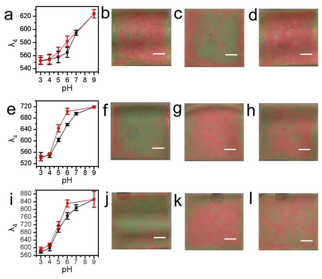 In another study, we showed that spatially isolated regions of a single microgel-based etalon were capable of exhibiting independent responses to solution pH and temperature [36]. In this investigation, we fabricated pNIPAm-co-AAc etalons, and independent drops of solutions (pH 3.0, 4.0, and 7.0) were added to the device surface. Three separate reflectance probes were added to the drops, and the etalons response to pH in those separate regions characterized. We observed that each reflectance spectrum behaved in a completely independent manner. Furthermore, the etalon's response can be visually observed, as can be seen in Figure 4. This observation could be used for a number of sensing applications as well as for display technologies.
