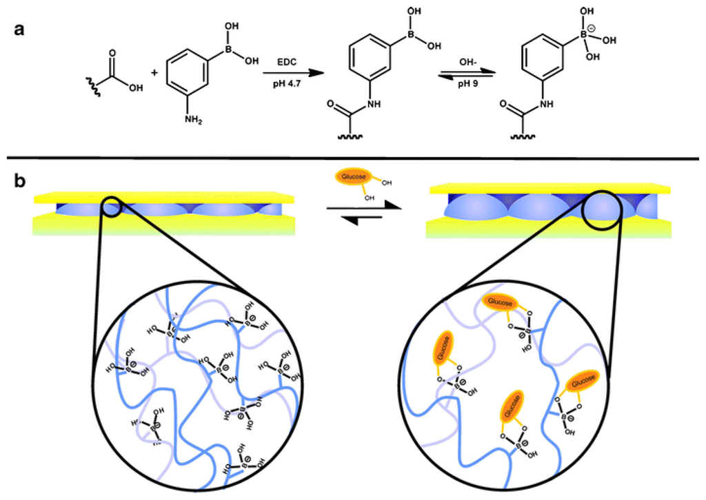 PNIPAm microgel-based technologies have been used previously by various groups for sensing and biosensing [1,10,18,42–48]. Specifically, Hoare and Pelton developed novel microgels for sensing glucose [42] in solution by observing a change in the microgel diameter that occurred due to the glucose-microgel interaction. Utilizing similar microgels, we were able to detect glucose in solution using our etalon technology [49]. To accomplish this, we first painted pNIPAm-co-AAc microgels onto a Au-coated glass substrate, followed by modification of the microgels with 3-amino phenylboronic acid, (APBA) by coupling it to the microgel AAc groups via 1-ethyl-3-(3-dimethylaminopropyl) carbodiimide (EDC). Following this, another Au layer was deposited on the microgel layer to yield the etalon. The fabricated etalon was immersed into a basic buffer where the boronic acid moieties on the APBA (pKa = 8.2) were hydroxylated such that the boron possessed a negative charge (Figure 6a). At this pH, the phenyl boronic acid moieties exist in equilibrium between the charged and uncharged state. But, the charged state is capable of binding diols, like glucose [42]. As glucose binds, more boronic acid groups must convert to the charged state in order to maintain the equilibrium, which effective lowers the APBA pKa. When glucose is present, the bound state is preferred leading more hydroxylation of the boron atoms into a charged form. This leads to an increase in the Coulombic repulsion of negative charges inside the microgel, thereby swelling the microgel (Figure 6b). As the microgel swells, the distance between two Au mirrors increases and we see a red shift in the reflectance spectra of the etalon, according to Equation (1).