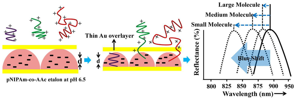 In more recent publications [11,28], we showed that microgel-based etalons could be used to detect the concentration of streptavidin in solution. This approach was a result of a previous study, where we established that pNIPAm-co-AAc microgel-based etalons at high pH (i.e., above the pKa of AAc is ∼4.25) could deswell when exposed to poly(diallyldimethylammonium chloride) (pDADMAc), which is a positively charged linear polymer (polycation) [24]. This is a result of the pDADMAc penetrating the outer Au layer of the etalon, resulting in electrostatic interaction induced intra and intermicrogel crosslinking and collapse. This collapse led to an observable shift in the peaks of the reflectance spectrum as predicted from Equation (1). We found that the extent of the shift in peak position depended on the molecular weight (MW) and concentration of polycations as shown in Figure 7 [24]. We went on to show that this approach could be made sensitive to various polyelectrolyte molecular weights in solution, which could be used for characterizing polymers in a complex mixture [38]. For all experiments, the sides of the etalon were sealed with epoxy to ensure that the polycation only entered the etalon through the Au overlayer.