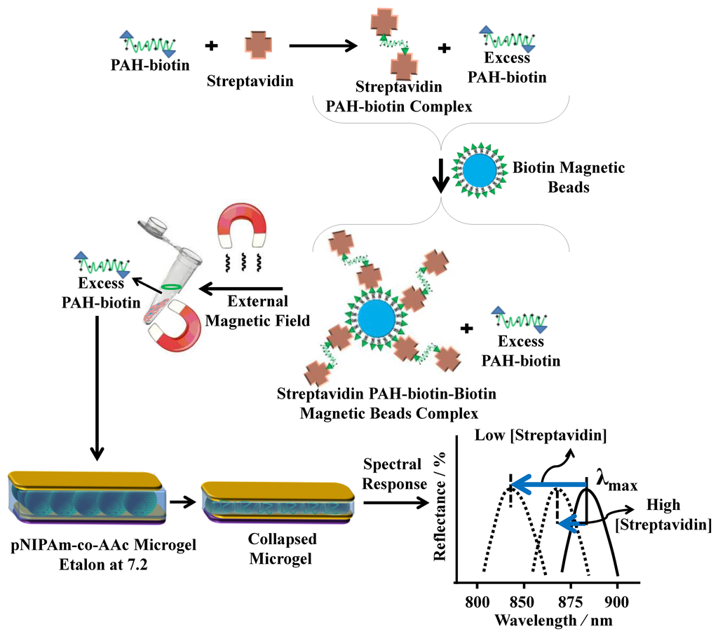 For sensing streptavidin, we exploited the above phenomenon using the polycation poly(allylamine hydrochloride) (PAH) [11,28]. To accomplish this, PAH, which is “completely” charged at pH < ∼9.0, was modified with biotin (PAH-biotin). We showed that the PAH-biotin could also penetrate the etalon and crosslink the microgel layer leading to a spectral shift. Likewise, we found that the extent of the reflectance peak shift again depended on the amount of PAH-biotin added to the etalon until the etalon was “saturated” [11]. For sensing, we exposed aqueous solution of PAH-biotin to specific amounts of streptavidin; the concentration of PAH-biotin was always high enough to leave excess PAH-biotin in solution after all the PAH-biotin-streptavidin complexes have formed. Then, biotin modified magnetic particles were added to the solution, which bound to the PAH-biotin-streptavidin complexes. An external magnet was used to remove the magnetic particles bound with PAH-biotin-streptavidin from the solution. The solution containing the excess, unbound PAH-biotin was subsequently separated and added to the pNIPAm-co-AAc etalon stabilized in pH 7.2 (microgels negatively charged) solution maintained at 25 °C. When the PAH-biotin was added to the etalon, it resulted in a blue shift of the etalon's reflectance peaks (the sensing mechanism is shown in Figure 8). We found that the extent of the blue shift depends on the amount of streptavidin initially added to the PAH-biotin. Here, a low concentration of streptavidin initially present in solution yields a large amount of excess, unbound PAH-biotin after the reaction. When the excess PAH-biotin is added to the etalon, a large shift in the reflectance peaks was observed. Alternatively, a high concentration of streptavidin initially present in solution yields a small amount of excess, unbound PAH-biotin that is added to the etalon, which gives a small etalon response. It is important to note that we were able to get increasingly large spectral responses with decreasing analyte concentration.