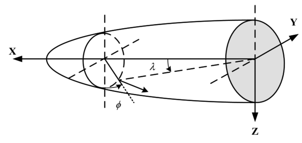 In Figure 1, ë indicates the cone angle, and ϕ denotes the circumferential angle. Furthermore, the pressure coefficient using the Newton formula can be written by [13]: