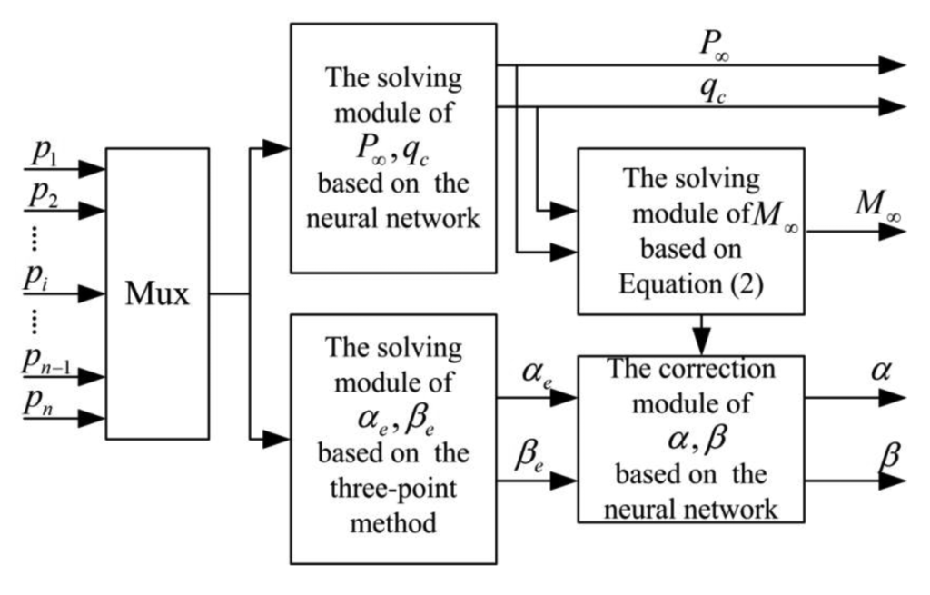 As mentioned above, we know that the expressions between the measuring pressures Pi and the flight parameters αe, βe, qc, P∞ are difficult to build, but on the other hand their relations can be identified depending on the experimental datum acquired by the tools of computational fluid dynamics. Moreover, the neural network is very suitable to establish such nonlinear connections, and the corresponding structure diagram of the solving algorithm using the neural networks is proposed as shown in the following figure.