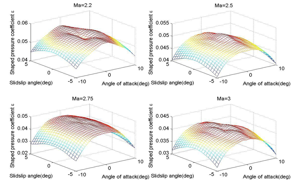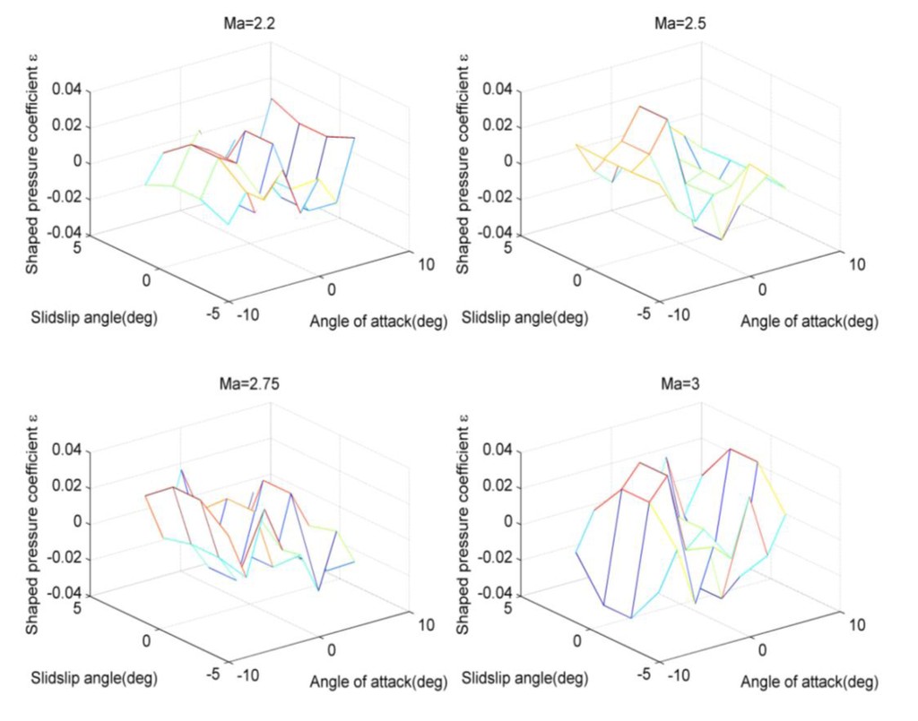 The shaped pressure coefficient ε is critical to solve the air parameters, but according to Equation (7), it is related with the angle of attack, sideslip angle and flight Mach. Therefore, ε needs to be identified first. Based on the three-point method, as long as the pressures are obtained, the local angle of attack and local sideslip angle can be computed accordingly. After that, ε is obtained in accordance with Equations (18)–(20), while considering the current flight Mach. In the simulation, for the body surface in Figure 1, the pressure data of the measuring taps corresponding to M∞ = 2.2, 2.5, 2.75, 3, can be acquired by using the CFD tool, so the change curves of the shaped pressure coefficient ε are provided as follows.