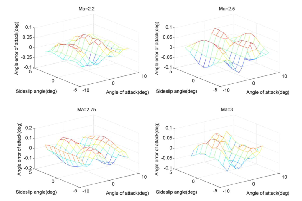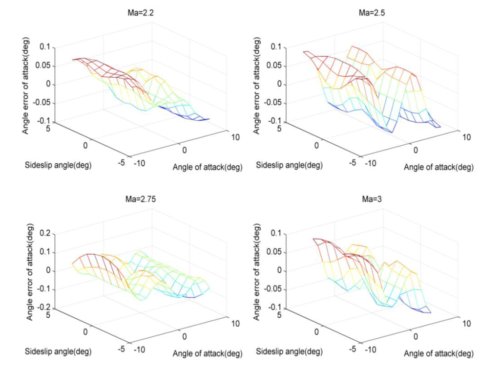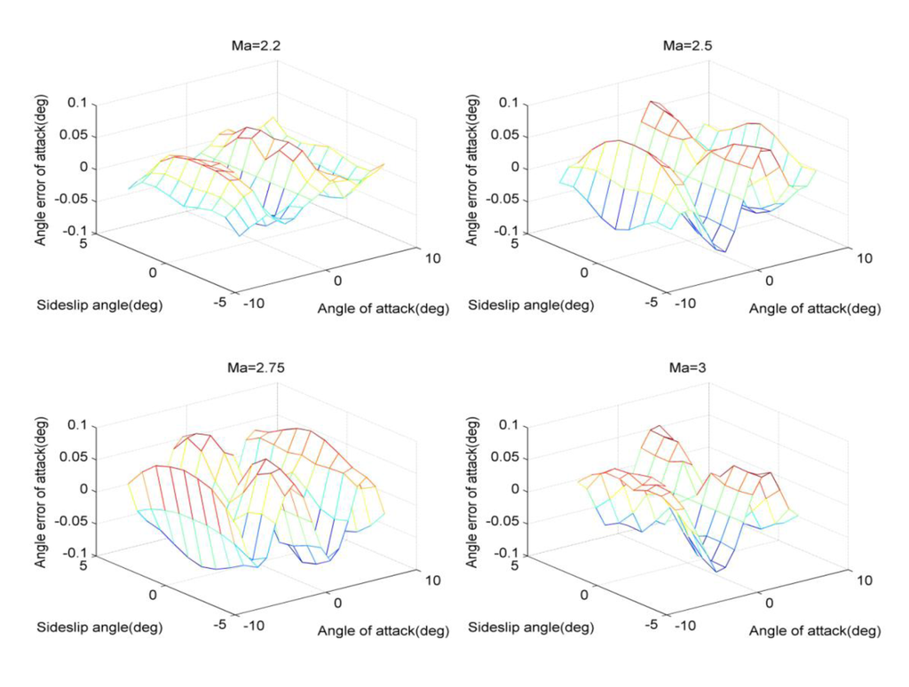 Figure 3 shows that the relations between the shaped pressure coefficient and the according flight parameters, and such results reflect the nonlinear features associated with Equation (7). Furthermore, using these different solving algorithms, the angle errors of attack between the solving results and the CFD data are displayed as follows.