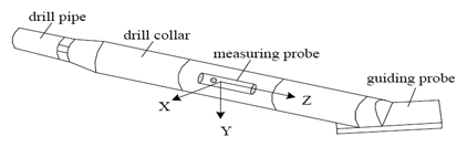 For directional well logging attitude measurement, the guiding parts mainly include a sensor module, signal acquisition module, microcontroller module and communication interface (SPI, SCI). All these component are assembled in a probe casing with small size and diameter (φ35 mm × 260 mm), and a PC works as the remote control and display device. The mechanical configuration of a logging tool can be expressed as shown in Figure 1. It includes a variety of mechanical fittings and a guiding probe which is the core measurement device.