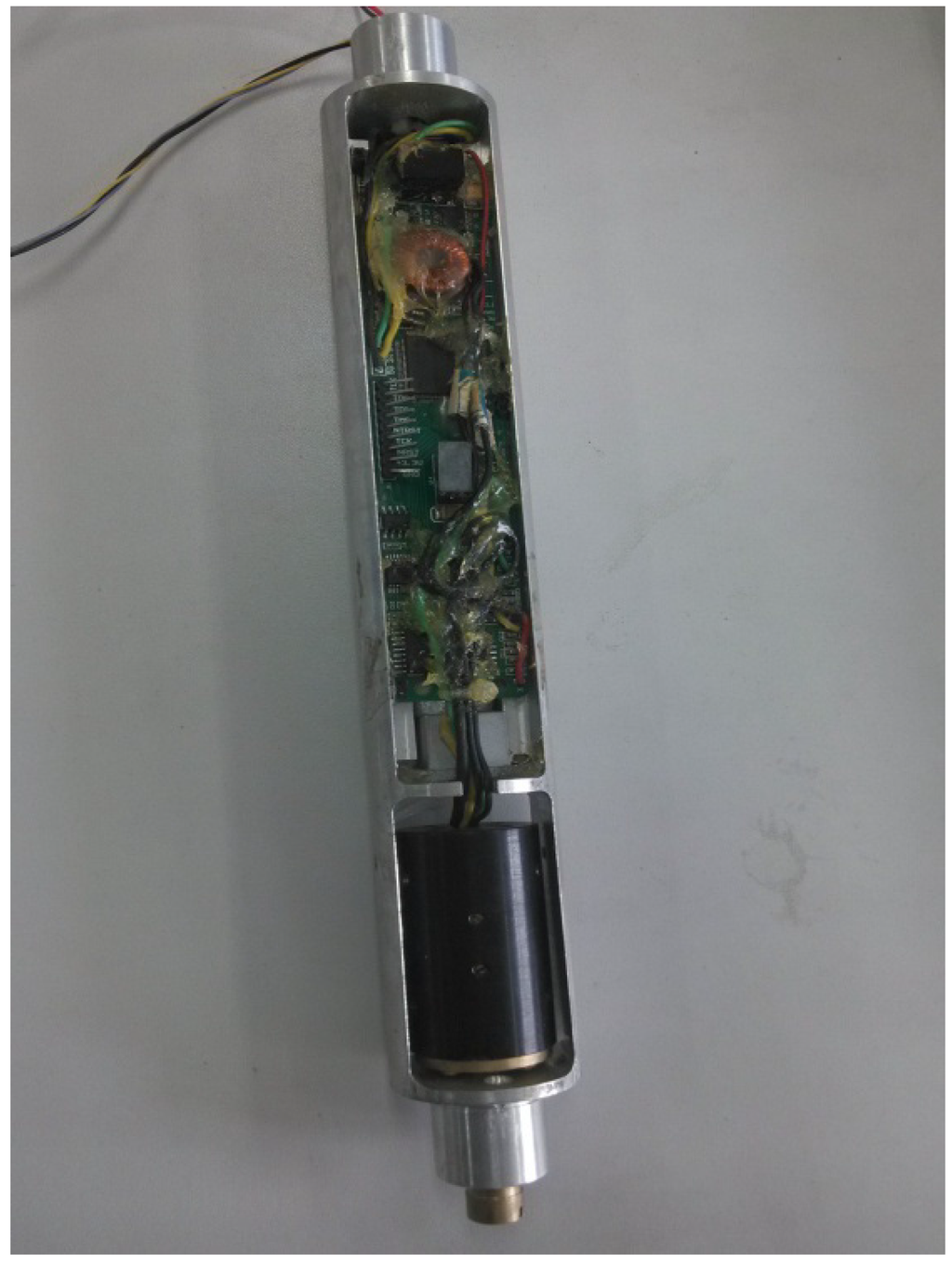 A picture of the designed measuring probe is shown in Figure 2. The measuring probe is used to measure and respond in real time to the posture information of the drilling tool, and it is also designed as an aluminum cylinder structure, so that the device is compact, nonmagnetic and especially convenient for other mechanical adaptations and subsequent turntable experiments.