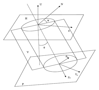 As shown in Figure 4, the navigation coordinates E/N/U are defined as east/north/up based on the right-hand rule, and the device body coordinates Xb/Yb/Zb are defined as forward/right/down based on the right-hand rule. H represents the horizontal plane; V the borehole bending plane; and P the drill cross section. The tilt angle (θ) is an angle between Zb axis and the vertical direction, and the azimuth angle (Ψ) is an angle between the horizontal projection of Zb axis and north.