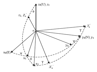 A device can always transform a fixed location to the current location through a rotation matrix. As shown in Figure 5, the navigation coordinates ox0y0z0 (oENU) are used as a reference frame and clockwise rotation is positive. Firstly rotate an angle of ψ around oz0 to the coordinates ox1y1z1, then an angle of θ around oy1 to the coordinates ox2y2z2, finally an angle of T around oz2 to the coordinates oX′bY′bZ′b which are the device body coordinates.