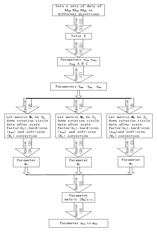 So the parameters from m10 to m33 can be calculated by Equation (11). The calculation process of fluxgate sensor calibration parameter is shown in Figure 7.