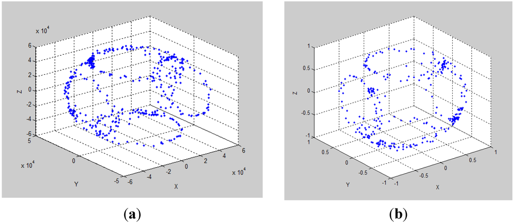 There is a standard method to show the fluxgate calibration results. As shown in Figure 9, Figure 9a is an ellipsoid before fluxgate calibration and Figure 9b is a normal sphere, which proves that the fluxgate errors of the scale factor and center offset have been calibrated.