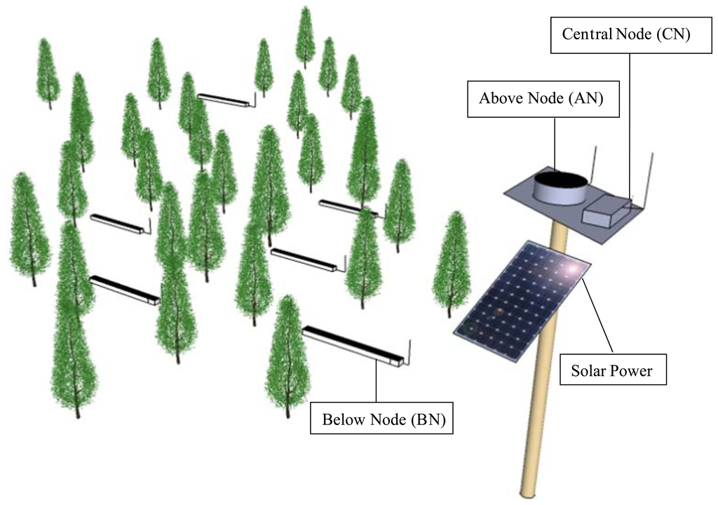 In actual field measurements, BN can be positioned below the canopy in a distributed manner, and the number and spacing of BNs can be flexibly adjusted according to the size of the study area. BN can directly communicate with CN, or the data from BN can be forwarded to CN by means of a data relay realized by other BNs. A similar form of communication applies to AN and CN, but fewer numbers of ANs are needed for actual deployment; in most cases, the ANs are positioned side-by-side with the CN (Figure 1). Therefore, no other node is needed for data-forwarding between AN and CN.