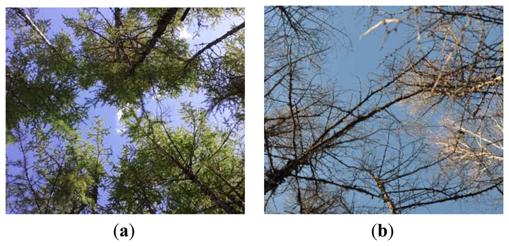 Coniferous forest structure parameters, such as the clumping index (CI) and leaf area index (LAI), are major factors influencing the capacity of vegetation to intercept solar radiation for photosynthesis. The definition of the CI is related to the measurement of the LAI, which is defined as half of the total leaf area per unit ground surface area [1]. The indirect measurement of LAI using optical sensors generally assumes that the foliage is randomly distributed in the canopy [2–6]; however, the distribution of foliage is spatially confined in the natural world and therefore not random [7–11]. The concept of a clumping index aims to describe the nonrandom distribution of foliage in the canopy [6–8,11]. When the CI is greater than 1, the foliage is considered to be regularly distributed; when the CI is equal to 1, the foliage is considered to be randomly distributed, and when the CI is less than 1, the foliage is considered to be clumped. The extent to which the foliage is clumped is inversely proportional to CI; that is, the more the CI approaches 1, the less obvious the clumping effect and the more the foliage tends to be randomly distributed. In fact, the measured LAI is an effective leaf area index (LAIe), which is the product of the true leaf area index and clumping index.