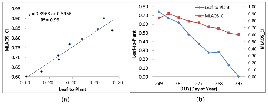 As observed in Figure 11 and compared to the scatter diagram of Figure 9, it is evident that, when the woody components in the coniferous forest canopy area index are removed and only the dynamic changing characteristics of coniferous foliage are retained, the MLAOS observation results can better reflect foliage changes (Figure 11a) in coniferous forests. Furthermore, the determination coefficient for the regression equation can reach 0.93, indicating great consistency of changes from foliage development. This pattern of change is also demonstrated in the developmental trend of the temporal sequence (Figure 11b). The proportion of coniferous foliage decreases gradually over time; the canopy CI also presents a decreasing trend during this process, and a CI decrease indicates an increase in the canopy clumping degree. Therefore, when foliage falls, the canopy foliage is distributed in a more non-random manner, which increases the distributional heterogeneity of solar radiation in the canopy. The experimental results indicate that the CI observed from the MLAOS revealed most of the foliage clumping at the canopy scale.