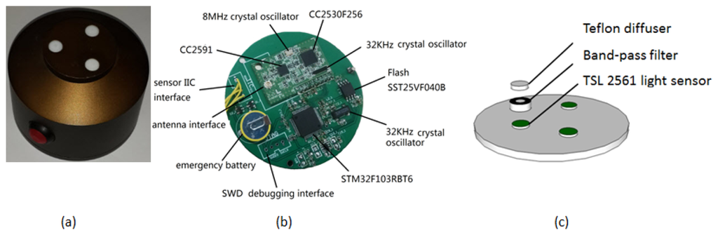 The choice of light sensors was also critical, with small size, low cost and low power consumption among the selection criteria. We have chosen a low-cost TSL2561 light to voltage sensor from AMS-TAOS Company (Unterpremstaetten, Austria) [31], shown at Figure 2b. The sensor's communication to the device is accomplished through a standard I2C serial bus. Consequently, the TSL2561 device can be easily connected to the microcontroller (MCU). No external circuitry is required for signal conditioning, thereby saving printed circuit board (PCB) space as well. Since the output of the TSL2561 device is digital, the output is effectively immune to noise when compared to an analog signal. The sensor requires only 0.24 mA in full operation and it also has a power standby mode (3.2 μA) available to significantly reduce power consumption at sensor node sleep periods.