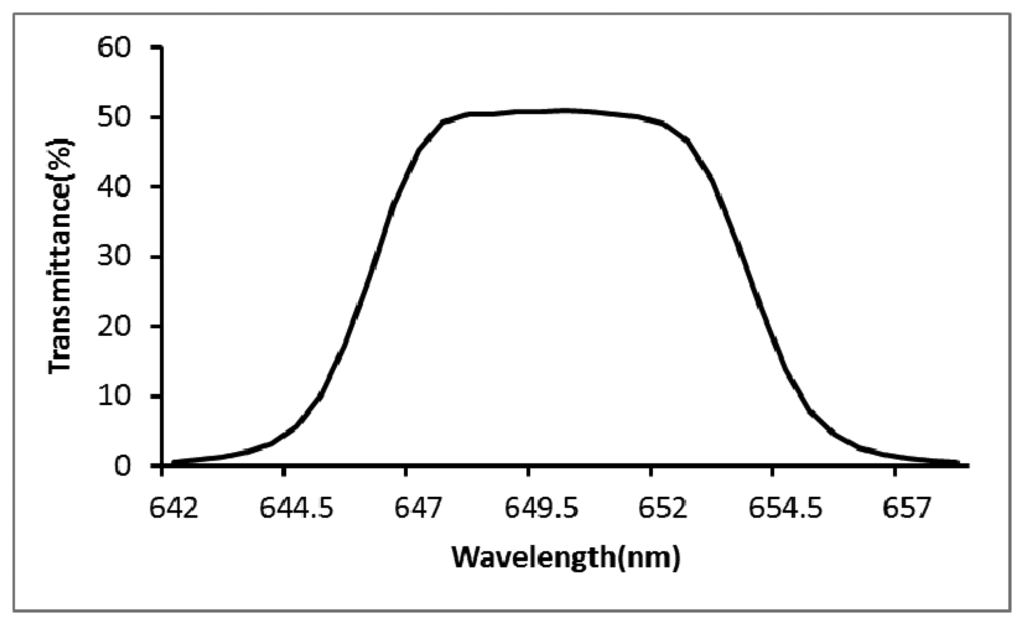 As explained in Section 2.1.1, the purpose of the MLAOS design is to obtain direct light transmittance of multi-angle solar radiation. To obtain an accurate ratio of direct light that penetrates the canopy, the influence of the scattered light must be eliminated; that is, the scattered light transmittance and the proportions of light from different solar elevation angles should be accurately measured. However, automatic measurement of the aforesaid data will increase the cost of the system and thereby reduce its usability. Therefore, for simplicity, we measured the approximate direct light transmittance according to the proportions of the different wavelengths of light in the solar spectrum that account for the scattered light. On sunny days, the scattered light in the sky is mainly produced by Rayleigh scattering; that is, the intensity of scattered light is inversely proportional to the fourth power of the wavelength. Therefore, red wavebands account for a relatively smaller proportion of the scattered light. For this reason, when designing the sensor, we added a band-pass filter with a central wavelength of 650 nm and a full width at half maximum (FWHM) of 8 nm to the optical sensor (Figure 2c); this approach can maximally ensure that the light that enters into the sensor is dominantly direct light. The response function of the band-pass filter is shown in Figure 3.