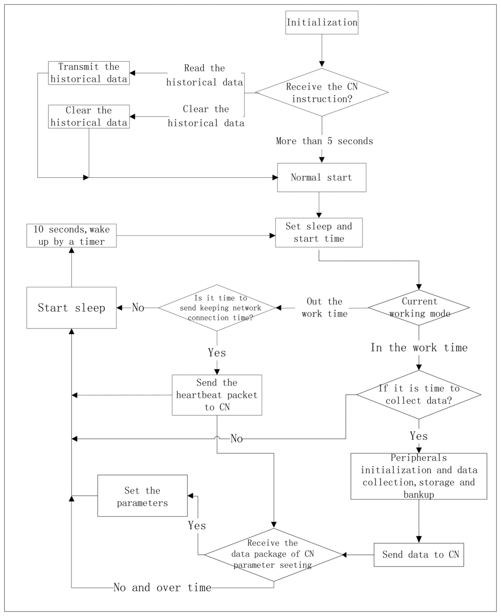 After being powered on or reset, the nodes enter a state of initialization. The commands of reading historic data or clearing historic data are received via wireless modules; if no command is received within 5 s, the system is started normally and begins running. Otherwise, the received commands are processed, and a transmission is executed, or the historic data that are stored on the flash drive are cleared. After the operation, the system begins running again.