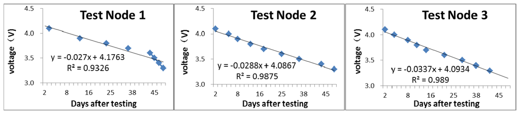 The test of actual power consumption was carried out in the laboratory. Three BNs were selected from all of the nodes, and a star-style topology network was formed with the CN; that is, the measurement data from each BN can be directly sent to the CN. The BN sampling frequency was 5 min, and the daily operation was 8 h, from 09:00 a.m. to 17:00 p.m.; these conditions meet the basic requirements of the solar zenith angle when measuring and calculating CI in the field. Before testing, the voltage was measured at 4.1 V. We recorded the voltage of the BN node every day as a basis for measuring the power consumption of the node.