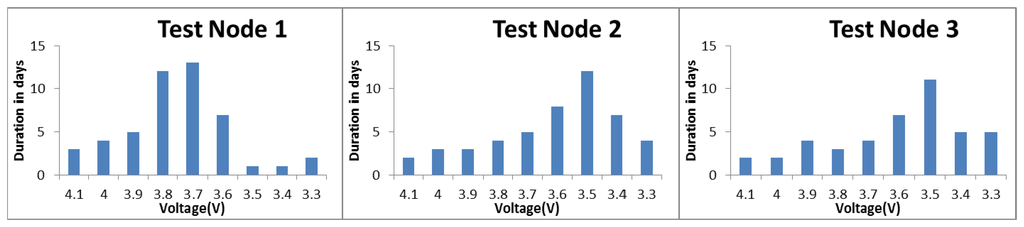 Figure 6 shows that, in general, the operating voltage of the three test nodes followed the same decreasing trend, except Test Node 1, which has a slightly larger slope after the 38th day. All three test nodes have the approximate rate of decay, i.e., the voltage reduction rates were approximately equal. This result indicates that the batteries used by the MLAOS are similar; also, we observe that the power consumption optimization design of the different MLAOS nodes is stable, and little difference exists among the nodes. The test results also showed that different continuous working periods (Figure 7) can be utilized at different voltage levels. During the initial operation, the voltage quickly decreased, as shown by the working period lasting only 2–3 days for 4.0 and 4.1 V for all three nodes; however, continuous operation of the nodes continued beyond 10 days, with a decreased voltage of 3.5–3.7 V. This phenomenon is in line with lithium battery discharge characteristics [33].