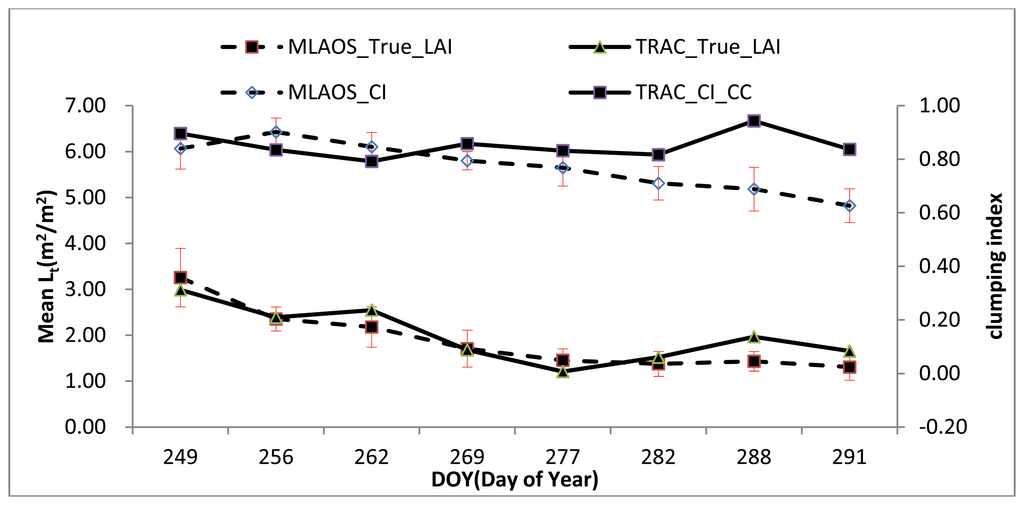 As shown in Figure 9, the scatter diagram comparing the CI and LAI clearly indicated that the MLAOS observations exhibited higher consistency than the TRAC data in the temporal sequence from DOY = 249 to DOY = 291, demonstrating that the CI observed with the MLAOS can better reflect the time-based dynamic characteristics of coniferous foliage clumping. In the MLAOS experiment, the average spacing of the MLAOS was 2–3 m in the field (Section 2.3.2), and the spacing between the sensors in each MLAOS was only 5–6 cm. Therefore, we assume that the CI values observed with the MLAOS should better reflect foliage clumping in coniferous forest canopies but might not well represent canopy clumping at the plot scale.