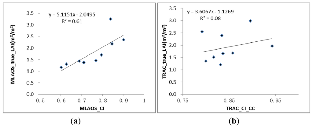 In Figure 8, TRAC_True_LAI and TRAC_CI_CC represent the true LAI and clumping index of the canopy obtained with TRACWin software implemented from Chen's algorithm [27], respectively. In addition, when processing data with the TRACWin software, we adopted a segmental mode for data processing. It is also important to note that neither the TRAC instrument nor the MLAOS system eliminated the proportions of needles-to-shoot or lignin during data processing. Therefore, the LAI obtained in this case should represent the plant area index; however, for consistency, we still use the term LAI.