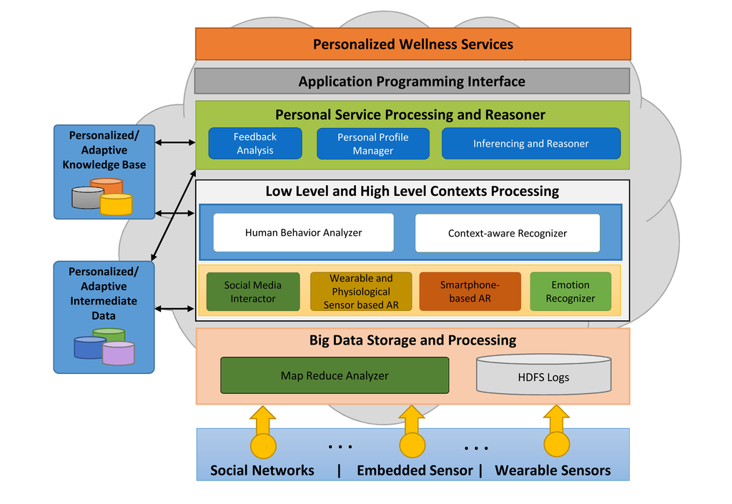 An active lifestyle is the process of enabling technology to improve a person's health and wellbeing in a proactive manner. As such, there is an increasing current desire for societies to engage with technology-based solutions that can prevent conditions from arising and to avoid a deterioration in health-related conditions. Nevertheless, in order to maintain good health, some care is necessary in a number of basic areas. According to the World Health Organization (WHO), health is defined across three primitive attributes; physical, mental and social wellbeing []. A strong connection exists between these attributes to maintain a healthy lifestyle [–]. For instance, a person with a poor physical health condition can be deemed as being at a high risk of developing a chronic disease, such as diabetes or cardiac-related complications. As a consequence, these factors may affect the person's mental health in terms of inducing depression and social isolation []. It is therefore recognized that a balanced combination of maintaining mental and physical health with social interactions can prevent the onset of a chronic disease. In addition to providing a means to manage conditions that may already exist [,,], recently, advances in information communication technologies (ICT), mobile solutions, wearable computing, cloud computing and big data infrastructures are expected to provide cost-effective solutions. It is anticipated that a complete system can accommodate a person's needs from a mental health, physical health and social-wellbeing perspective to provide the necessary levels of required smart care.